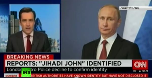 The photo of Putin was shown on CNN with the text: “Breaking News: Reports: ‘Jihadi John’ Identified: London Metro Police decline to confirm identity.”