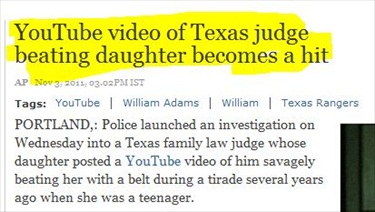 The video itself has garnered much criticism and many questions. But equally as questionable is this distasteful headline published by the Times of India to accompany a Nov. 3 Associated Press article. The headline reads “YouTube video of Texas judge beating daughter becomes a hit.”