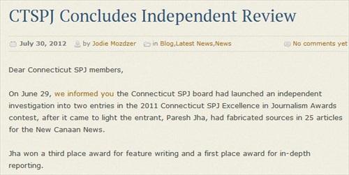 As we wrote, the New Canaan News fired Jha in June after learning he made up quotes and sources in 25 stories. Shortly after Jha’s firing, the Connecticut SPJ sent a memo about the disgraced reporter, noting that he had won two awards from the group just the month before his firing. The Connecticut SPJ also announced that “media lawyer and Syracuse professor” Roy S. Gutterman would lead an “independent investigation” of Jha’s award-winning reports.