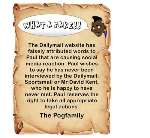 “The Dailymail website has falsely attributed words to Paul that are causing social media reaction. Paul wishes to say he has never been interviewed by the dailymail, Sportsmail or Mr David Kent, who he is happy to have never met. Paul reserves the right to take all appropriate legal actions.”