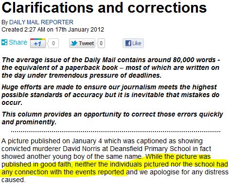 The Daily Mail apologized for running the wrong photo in its January 4 edition that misidentified a “young boy” as “convicted murderer David Norris,” Tabloid Watch reported.