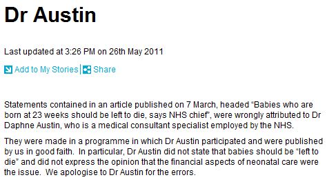 The Daily Mail has apologized to a doctor for reporting she said “babies who are born at 23 weeks should be left to die.” But, Tabloid Watch criticized the Daily Mail for burying the correction.