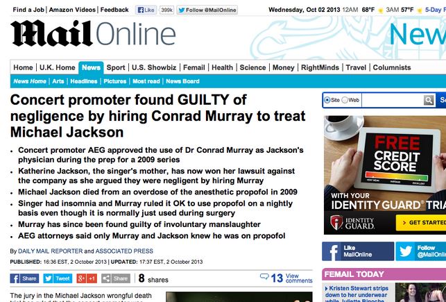 In reality, AEG, the concert promoter, was found not guilty yesterday. As CNN reported, AEG had hired Dr. Conrad Murray to treat Michael Jackson. While Murray was found guilty in Jackson’s 2009 death, “the jury decided that Murray was competent, so even though AEG Live hired him, it was not liable for Jackson’s death,” CNN wrote.