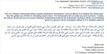 “The U.S. Embassy vehemently refutes remarks attributed to Ambassador Cameron Munter in a leading Urdu daily today that ‘the golden era of Pak-U.S. friendship cannot return.’ The Ambassador did not make any such comment. Further, the article overall was not an accurate reflection of statements made by the Ambassador during an off the record briefing given to a group of senior newspaper editors on U.S.-Pakistan relations.”
