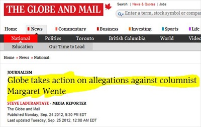 UPDATE: 9/27/2012 8:45 PM EST: The Ottawa Citizen’s managing editor Andrew Potter told iMediaEthics that the newspaper has no comment. Also, see iMediaEthics’ follow-up report, “Globe & Mail Reviewed ‘A Body of Work from Recent Years’ by Margaret Wente,” including comments to iMediaEthics from Stackhouse and the Ontario Press Council.