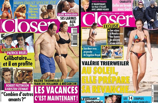 According to a 2012 Reuters report, Trierweiler sued Closer, Voici and Public for publishing cover pictures of the pair on vacation. Trierweiler was awarded 2,000 Euros from magazine VSD for invasion of privacy over the photos as well.