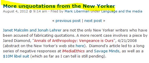 Language Log used the questions about Jared Diamond’s reporting along with the magazine’s recent resignation of quote fabricator Jonah Lehrer to argue that: