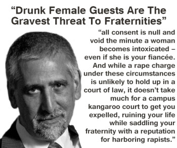 “Based on new standards being promulgated on campus, all consent is null and void the minute a woman becomes intoxicated – even if she is your fiancée. And while a rape charge under these circumstances is unlikely to hold up in a court of law, it doesn’t take much for a campus kangaroo court to get you expelled, ruining your life while saddling your fraternity with a reputation for harboring rapists.”