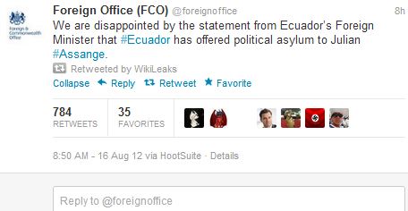 The Guardian’s live blog of the embassy decision news included a “full, translated version of the document presented to Ecuador by British diplomats.” The document explains that the UK wouldn’t comply with Assange being given asylum, and reads in part:
