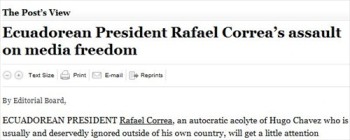 This is the Washington Post’s Jan. 12 editorial in question, titled “Ecuadorian President Rafael Correa’s assault on media freedom.” The editorial claims Correa’s attorney likely wrote the ruling in the libel case against El Universo and accused Correa of “the most comprehensive and ruthless assault on free media underway in the Western Hemisphere.”