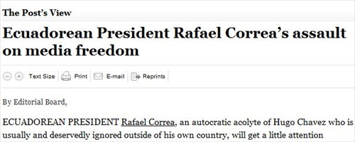 This is the Washington Post’s Jan. 12 editorial in question, titled “Ecuadorian President Rafael Correa’s assault on media freedom.” The editorial claims Correa’s attorney likely wrote the ruling in the libel case against El Universo and accused Correa of “the most comprehensive and ruthless assault on free media underway in the Western Hemisphere.”