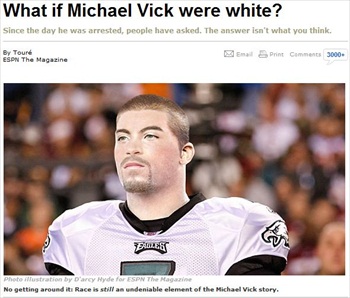 ESPN is being criticized for photoshopping an image of professional football quaterback Michael Vick to make him a white man. The image accompanied ESPN the Magazine‘s story “What if Michael Vick were white?”