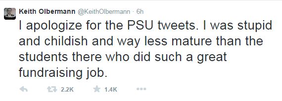 Olbermann apologized on Twitter. “I apologize for the PSU tweets,” he wrote. “I was stupid and childish and way less mature than the students there who did such a great fundraising job.”