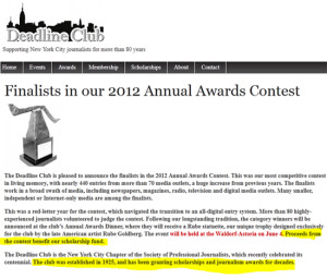 Only a small % of event proceeds go to scholarships, the charitable purpose of the Deadline Club Awards, while the club website soliciting 2012 ticket sales says: “Don’t miss this opportunity to mingle with journalists from The New York Times, The Wall Street Journal, The Associated Press…” |