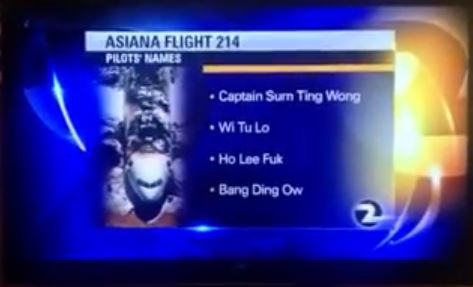 The station reported in a July 12 on-air report that the names of pilots were Captain Sum Ting Wong, Wi Tu Lo, Ho Lee Fuk, and Bang Ding Ow. The names of the pilots were read aloud and showed on air in a graphic, according to a YouTube video of the broadcast.