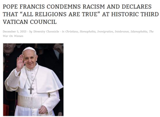 Diversity Chronicle’s Dec 5 story was titled “Pope Francis condemns racism and declares that ‘all religions are true’ at historic third Vatican Council.” The story claimed that the Third Vatican Council just “concluded” and Pope Francis made several comments that, if true, would have been extreme to have come from the Pope.