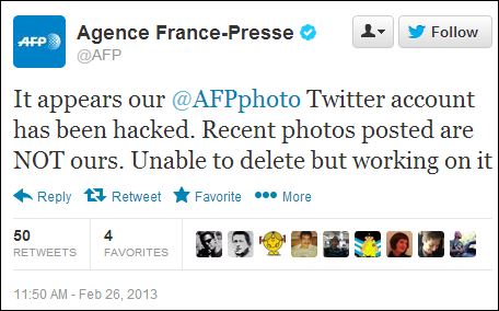 The AFP added in a news story that “the Syrian Electronic Army claimed responsibility for hacking the AFP account.” That is the same group that admitted to hacking Al Jazeera’s “mobile service” in September.