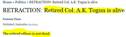 According to a Sept. 30 retraction and apology from the paper’s managing editor, Musikilu Mojeed, one of the paper’s “correspondents” turned in the story about Togum’s death based on interviews with “close family members.”