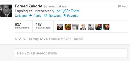 Zakaria was suspended last week by CNN and Time after his Time column was busted for having “close similarities” to an April article in the New Yorker, as we wrote. Zakaria apologized for his “serious lapse.” As we wrote earlier, the Washington Post said it was reviewing Zakaria’s work for the newspaper. According to this new Post report, Zakaria’s column “will not appear this month.”