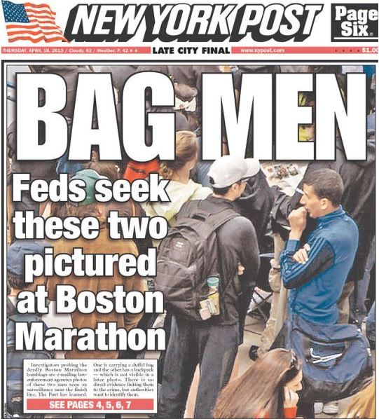 The image, headlined “Bag Men,” suggested the two young men were the suspected bombers but, as the world found out hours later, the FBI had identified two other people — known now to be the brothers Tamerlan and Dzhokhar Tsarnaev — as suspects in the bombings.