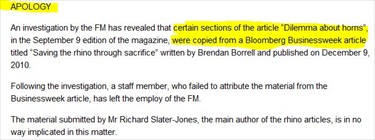At the time, Brendan Borrell, who wrote the article that was plagiarized, told iMediaEthics that while he was “pleased with the response of the Financial Mail,” he would “like to see the apology” online.