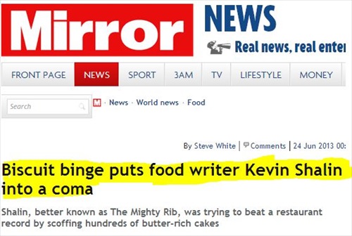 The Mirror’s story, “Biscuit binge puts food writer Kevin Shalin into a coma,” has since been unpublished but was published June 24. The Daily Mirror’s article was deleted from its website, but iMediaEthics found a Google Cache of the article, which didn’t provide any attribution or sourcing. The Mirror suggested that it did all the “reporting” to get the story, writing that “doctors confirm” the story, and using quotes from the RockCitytimes story.