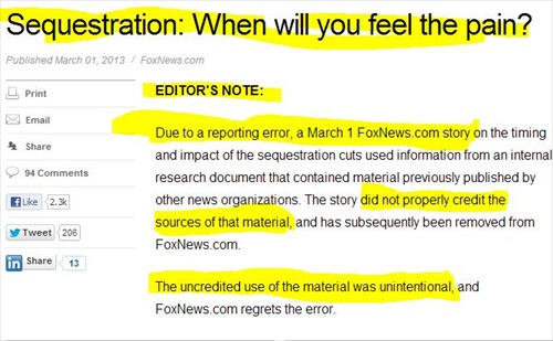 “Due to a reporting error, a March 1 FoxNews.com story on the timing and impact of the sequestration cuts used information from an internal research document that contained material previously published by other news organizations. The story did not properly credit the sources of that material, and has subsequently been removed from FoxNews.com.