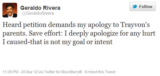 But, BusinessWeek explained Rivera said “I don’t apologize at all for the substance of my advice. I was trying to save lives.” And, Rivera tweeted March 26 “Heard petition demands my apology to Trayvon’s parents. Save effort: I deeply apologize for any hurt I caused-that is not my goal or intent.”