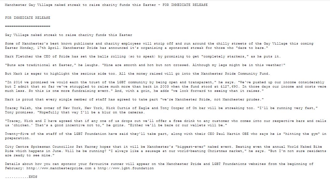 The UK Manchester Evening News fell for a hoax press release claiming there was going to be a “naked streak” in Manchester’s Gay Village to raise money, the Press Gazette reported.