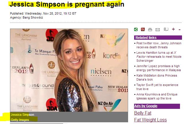 iMediaEthics found the Getty error when looking into DNA India’s use of the photo with its Nov. 28 report, “Jessica Simpson is pregnant again.” The article, by “entertainment news agency” Bang Showbiz, reports on American celebrity gossip magazine US‘s anonymously sourced report claiming Simpson, the Texas-born singer, is pregnant. DNA India identifies itself as a seven-year-old Mumbai-based “English broadsheet daily.”