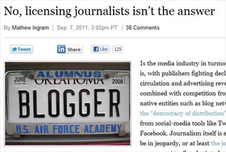 In a Sept. 7 post, Giga Om’s Mathew Ingram criticized suggestions of “licensing journalists” to help rein in journalism. (See iMediaEthics’ story here about Quebec culture minister Christine St-Pierre’s calls to license journalists.) GigaOm describes itself as “the leading provider of online media, events and research for global technology innovators.”