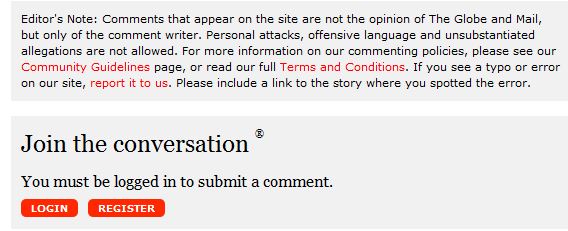 The Globe and Mail’s “Community Guidelines” read, in part, “While we are committed to principles of openness and freedom of speech, however, we will not allow our site to become a haven for personal attacks and offensive behaviour.”