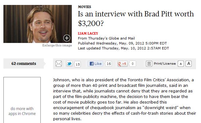 The Globe and Mail noted that Alliance Films wasn’t keen on Maclean’s publishing its original blogpost about the paid interviews, writing :