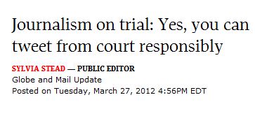 The Globe and Mail’s public editor Sylvia Stead weighed in on the newspaper’s coverage of a murder trial again, this time focusing on how the newspaper is reporting on Twitter. The trial in question is for the murder of Victoria (Tori) Stafford, who was killed in 2009.