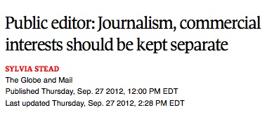 Globe and Mail public editor Sylvia Stead reported Sept. 27 that the newspaper’s “editors agreed” it was inappropriate for freelancer Leah McLaren to write about “her own house which was up for sale” in a column for the newspaper’s real estate section.