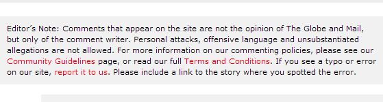 The Globe and Mail’s Community Guidelines explain in part that “In most cases our comments are post-moderated, which means that we don’t review them prior to posting them (although we use an automated filter to block offensive words).”