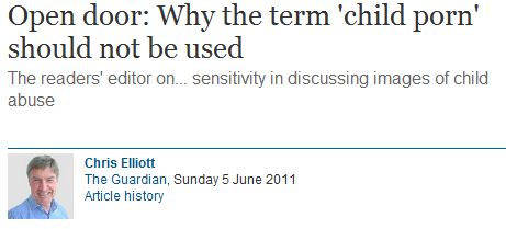 The Guardian’s readers editor, Chris Elliott, wrote earlier this month about the terminology “child porn.” Elliott wrote that a reader complained over the use of the term “child porn” because the term sometimes refers to people “who have been abused and filmed” or “abused and exploited.”