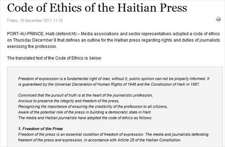 Haitian media groups including the National Association of Media in Haiti, the Association of Independent Media of Haiti, the Association of Haitian Journalists and the Haitian Journalists Union photographers, among others, agreed to a new code of ethics for Haitian media, online Haitian news site Defend reported.