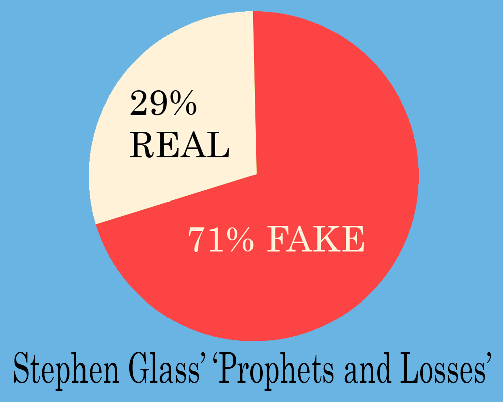 Seventeen years later, notorious fabricator Stephen Glass finally has fessed up to what he faked in his story for Harper’s Magazine, “Prophets and Losses.” It ended up being a whopping 71% of the story.