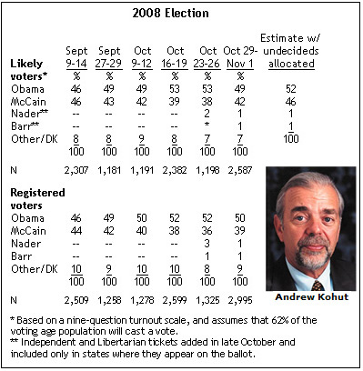 Andrea Seabrook: “Why are the polls – the polls seem to be converging across the polls towards the sort of five-point lead for Obama, when they had been pretty disparate – there had been a lot of difference between them?” Andrew Kohut: “The answer to that is that the closer we get to the election, the more crystallized public opinion is and therefore the more likely it is when we make a telephone call, we’re going to get the same answers as another polling organization will get. These voters have made up their minds and there’s not so many of ‘I’ll vote for this guy one day and if you call me tomorrow I’ll vote for someone else.’ So, it’s pretty typical that the polls – rigorous polls – all come together in the final weeks.” |