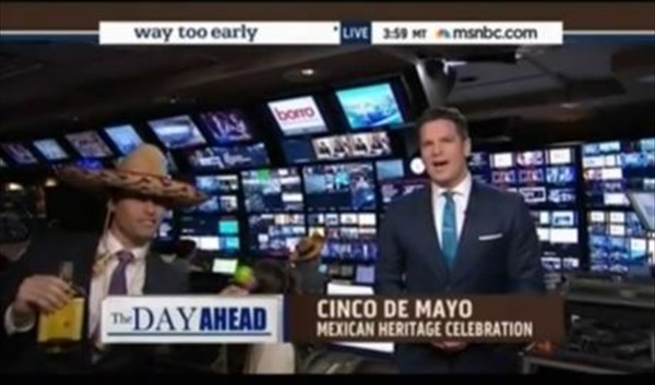The May 5 segment, aired on MSNBC’s Way Too Early program, featured MSNBC’s Louis Burgdorg donning a sombrero and throwing back tequila shots and dancing with a maraca. During the segment, MSNBC’s Thomas Roberts called Cinco de Mayo “an excuse to drink tequila on a Monday morning at work” for MSNBC’s Burgdorg.