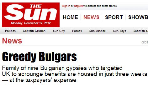 The UK Sun’s ombudsman told iMediaEthics that the headline “Greedy Bulgars” — referring to a Bulgarian family — was only “a humorous play on words.” The Bulgarian Embassy in London, however, begs to differ, telling iMediaEthics that it views the headline, “Greedy Bulgars,” as “unacceptable.”