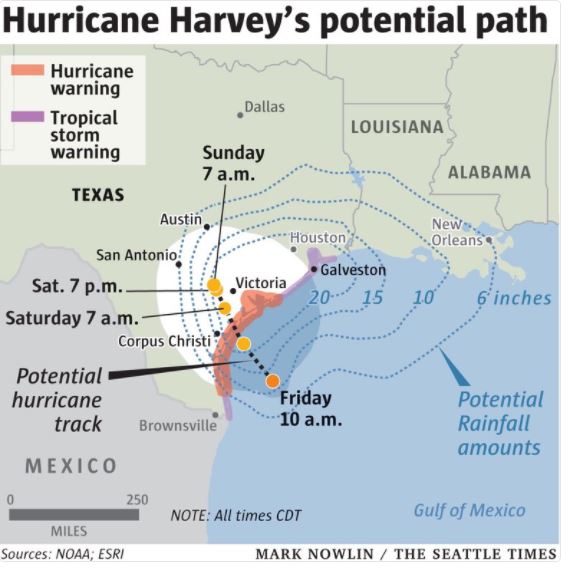 The map, credited to the Seattle Times‘ Mark Knowlin, was titled, “Hurricane Harvey’s potential path,” and accompanied an Associated Press article about the storm. The newspaper also tweeted the inaccurate map, AL.com reported.