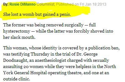 DiManno’s controversial column on the trial of an anesthesiologist and testimony of an unnamed woman’s rape while under anesthesia for a “full hysterectomy,” read in part: