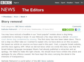 The Christian Science Monitor‘s unpacking of the dog hoax spotted that the BBC failed to include one very relevant fact from its source, the YNet report on the dog stoning — the denial of the story from the head of the court, Levin.