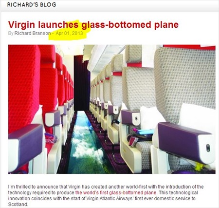 The Mirror’s original story on the glass-bottomed planes was written as fact with no apparent disclosure that the Mirror was in on the joke. The article doesn’t name any sources but does link to and quote Richard Branson from Virgin’s announcement blogpost on the planes.