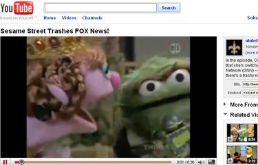 It was this statement that triggered reactions. A conservative blogger at Andrew Breitbart’s Big Hollywood writing under the pseudonym “Stage Right” (via John Nolte at Big Hollywood) interpreted the Sesame Street sketch as an attempt by the radical left to “turn our kids against us.” Stage Right argued that, “If Mom and Dad watch cable news, it’s better than 50/50 they watch ‘POX News.’  So what gives? PBS — a network partially funded with my tax dollars — has the right to tell my kids that their parents watch “trashy” news?  The message is clear, I can’t even sit my kids in front of ‘Sesame Street’ without having to worry about the Left attempting to undermine my authority.”