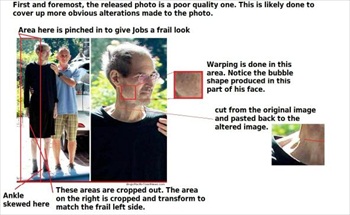 Reddit users marked up this version of the photo to indicate possible photoshopping and to question the credibility of TMZ. The Daily Beast explained that Reddit users highlighted “signs that the image was pinched to make Jobs look more frail; that parts of the image have been cropped; and that some of the shapes in the image are unnatural.