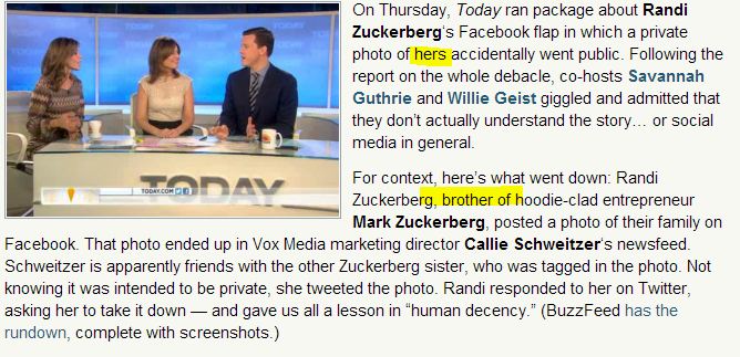 Mediaite misidentified Randi Zuckerberg as Facebook creator Mark Zuckerberg’s brother in a story about a private photo of the Zuckerberg family that went public.