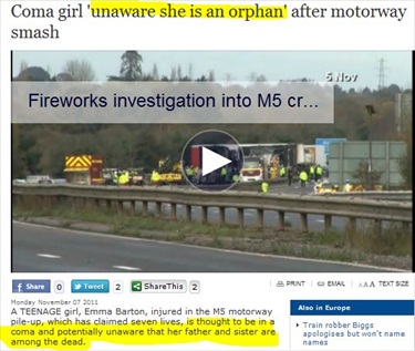 While the headline declares “Coma girl ‘unaware she is an orphan’ after motorway smash,” the story reports that Barton is “thought to be in a coma and potentially unaware that her father and sister are among the dead.”